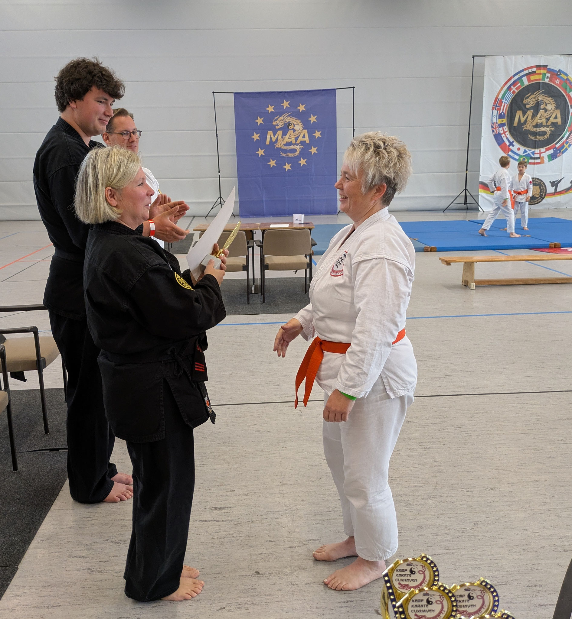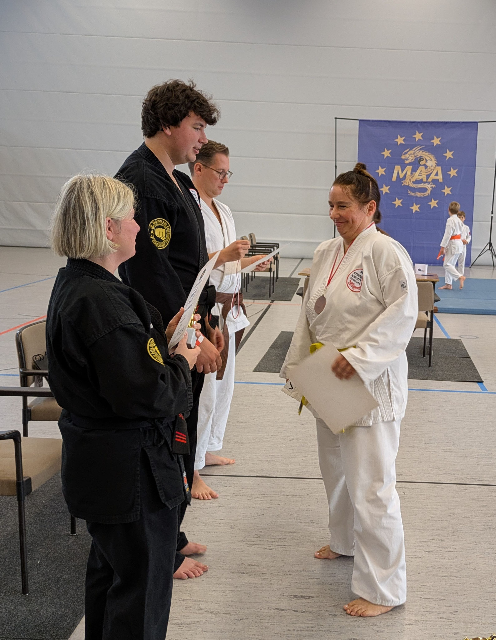 Schauen, lernen, üben - und am Ende noch Medaillen umgehängt bekommen. Wer wollte da Nein sagen. Jacqueline „Line“ Soyez sicherlich nicht. Und ihre Eleven auch nicht. Also auf nach Dorsten-Wulfen. In dem eher verschlafenen Stadtteil zwischen Ruhrgebiet und Münsterland ging es am dritten Mai-Wochenende richtig rund. Die Martial Arts Association, kurz MAA, lud zu ihrem MA-Day, der nach eigenem Bekunden „Europas größtes Benefiz Kampfkunst-Seminar Event“ ist. Dafür nahmen die Karatekas des ATSC gerne die gut 300 Kilometer lange Anreise in Kauf.