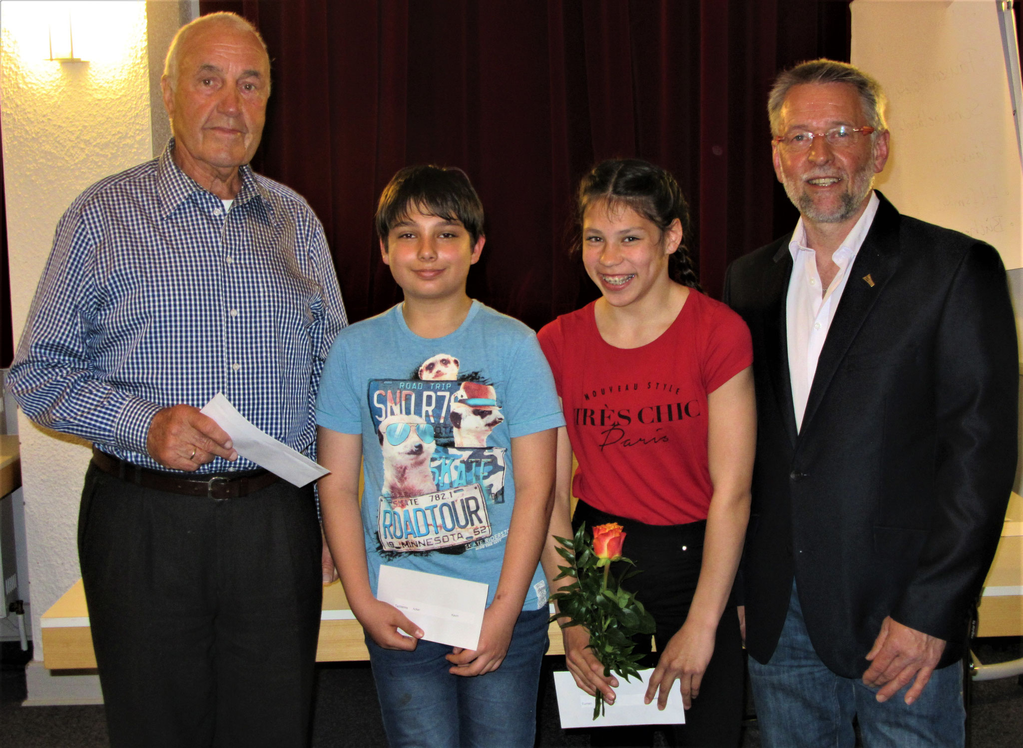 Die erfolgreichen Schwimmer des Jahres 2018/2019 bzw. Ein Weltmeister und zwei Nachwuchssportler (v.l. Helmut Brüning, Kevin Acker, Charlotte Neumann, Manfred Abbes)